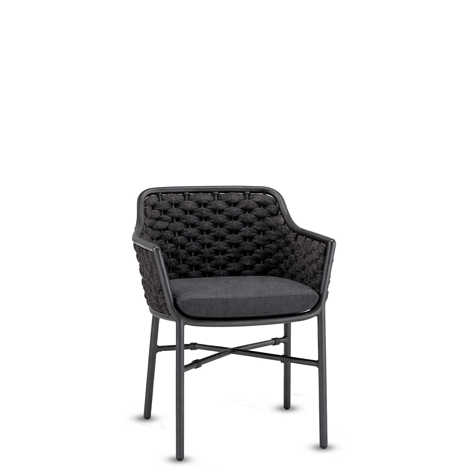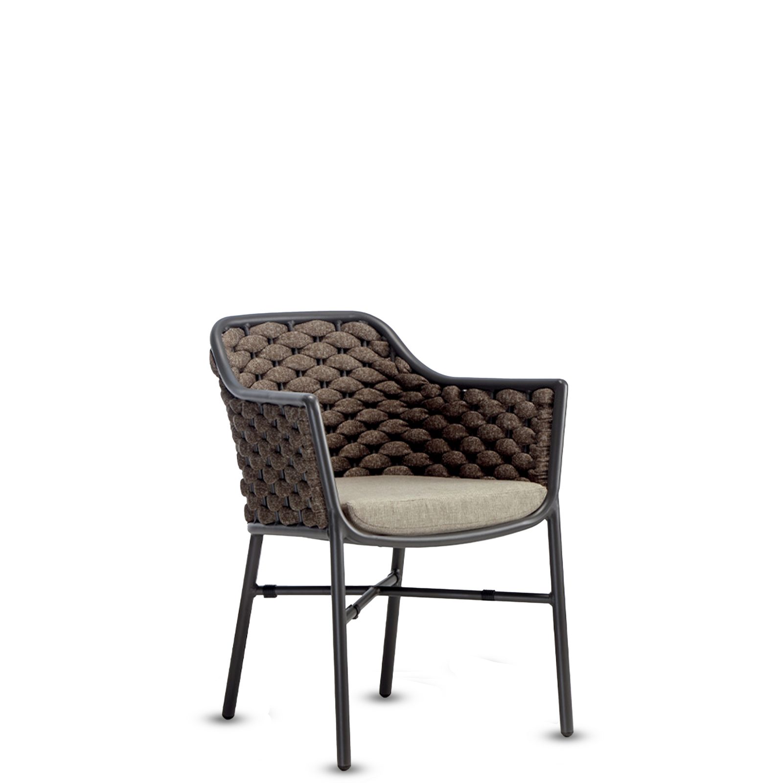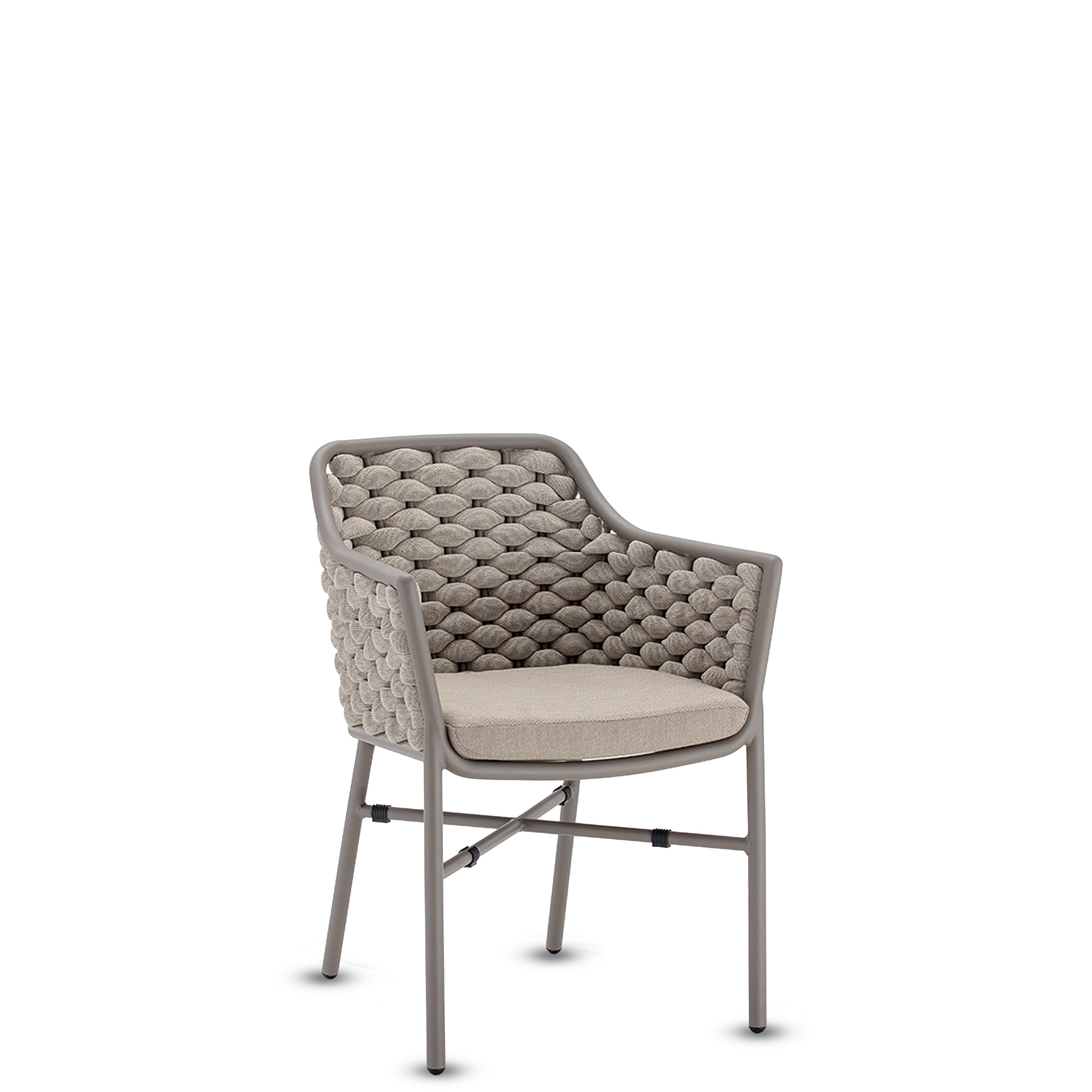 Aluminium stackable armchair, upholstered with polyolefin rope, with an textylene cushion.